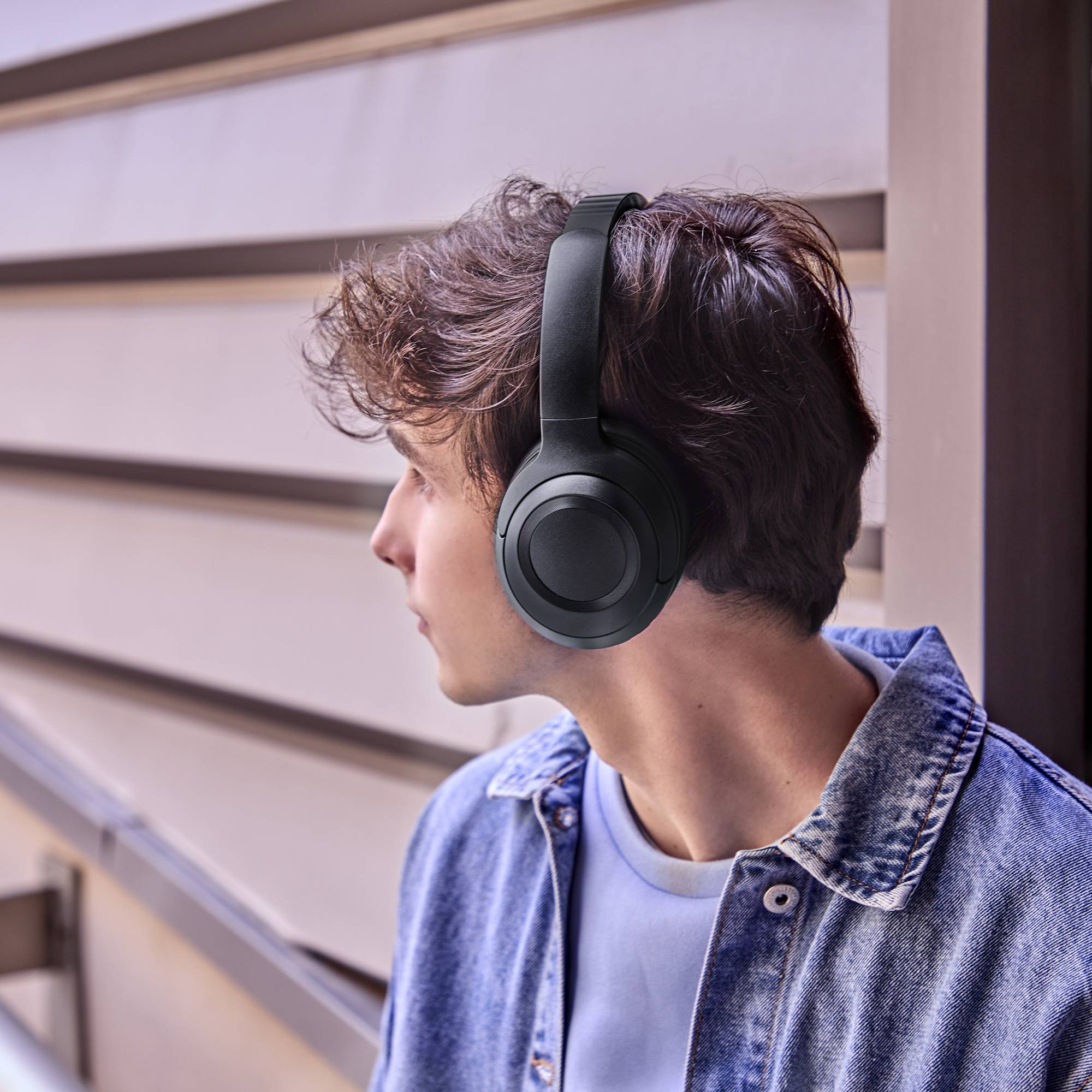 Auriculares Bluetooth con tecnología Active Noise Cancelling fabricados con plástico reciclado. 50h de autonomía, micrófono con cancelación de ruido ambiente (ENC) para llamadas nítidas y un estilo y comodidad superior gracias a su diadema metálica plegable y sus almohadillas de cuero proteico.